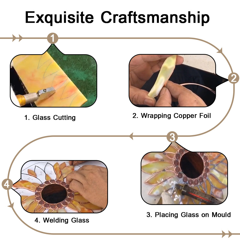 Stained glass window hangings adopt classic art design, art, and sunlight-integrated, pure American style. Each real glass is hand-cut and copper foil is wrapped, then welded by hand to create unique designs, adding a beautiful ambiance to the home.